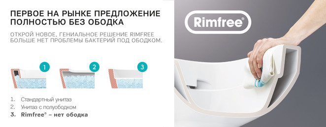 Найбільш вразливим місцем в унітазі до впливу бактерій є ободок. Але унітази Rimfree , завдяки унікальній конструктивної особливості чаші унітазу і особливому водораспределітель дозволяє позбутися проблемного обідка. Таким чином, позбавивши від самих важкодоступних для якісного прибирання місць. Отже, на прибирання тепер можна витрачати істотно менше і часу, і, що важливо, засобів.
